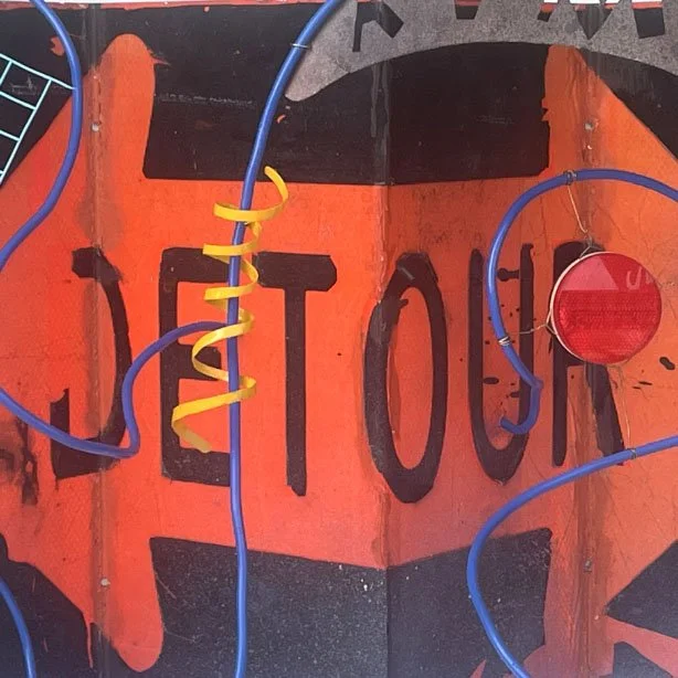 Wandering without a plan. A road crew left behind the detour sign, worn, it’s paint peeling. It was longer than I could use, so I decided to make it more dimensional. It was a thick aluminum gauge I couldn’t bend by hand, so I found a machine shop to bend it. I made a mockup as a bending guide. I added a blue, heavy-gauge aluminum wire as the rambling path and attached random objects, wire mesh, and a skateboarder to create a bit of Wander-land.
