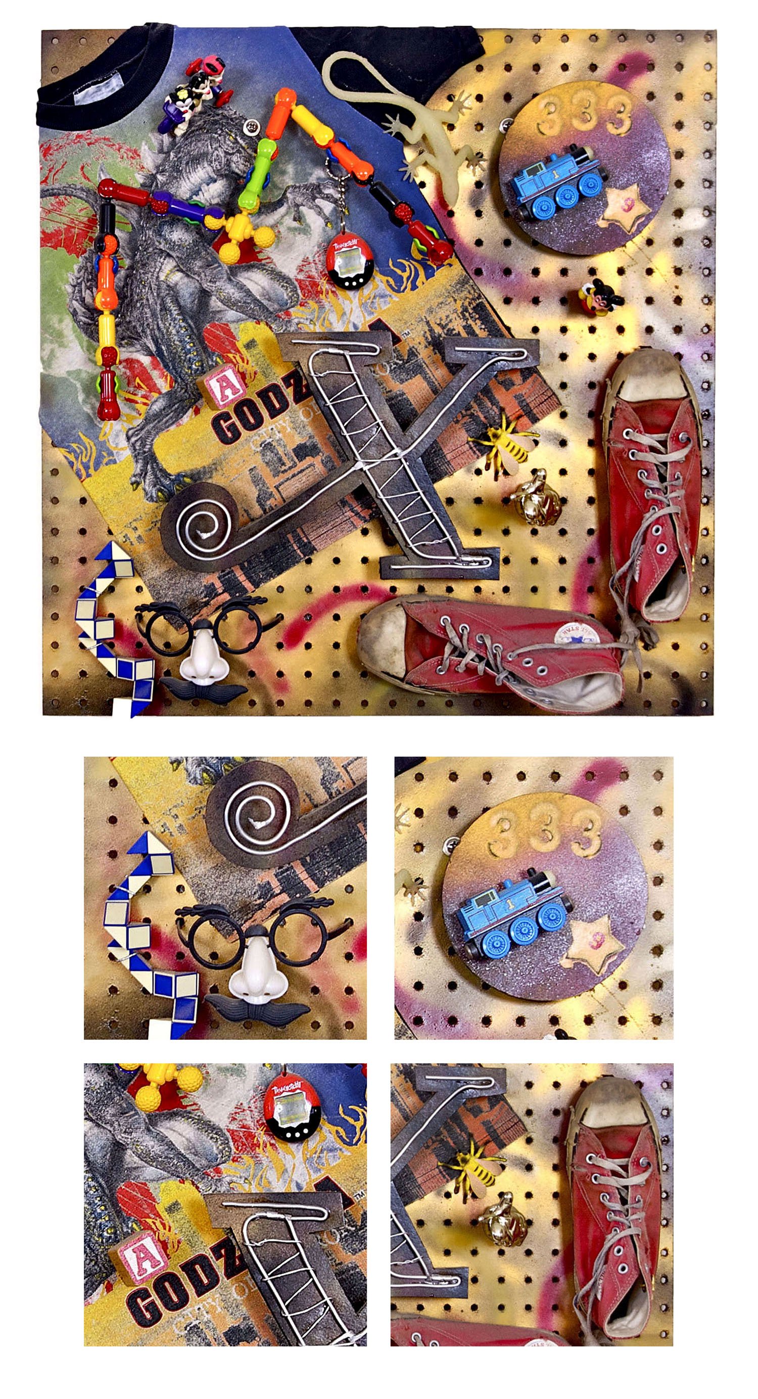 Size: 24”w x 24”h x 6”d. Materials: Materials: Peg board, T-shirt, zoobs (plastic building toys), cardboard, sports trophy, plastic toys, high-gauge aluminum wire, spray paint.